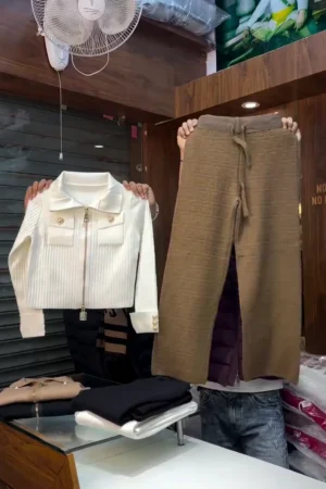 Luxurious Knit Zippered Jacket and Wide-Leg Trousers Set in Contrasting White and Black with Monogrammed Brown Variation