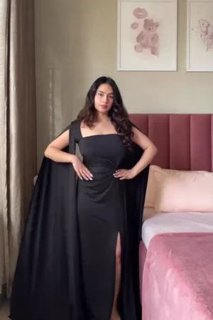 Elegant Dual-Style Formal Collection: Romantic Off-Shoulder White Gown & Sophisticated Cape-Sleeve Black Slit Dress