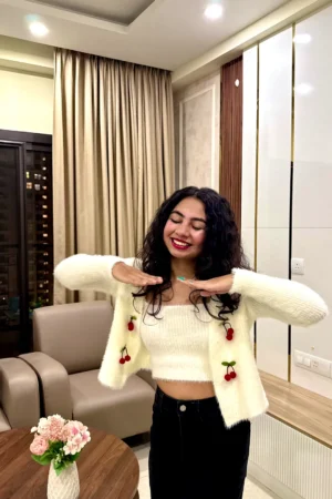 Whimsical Winter Co-ord Set | Hand-Embroidered Cherry & Floral Motif Soft-Knit Cardigan and Top Ensemble