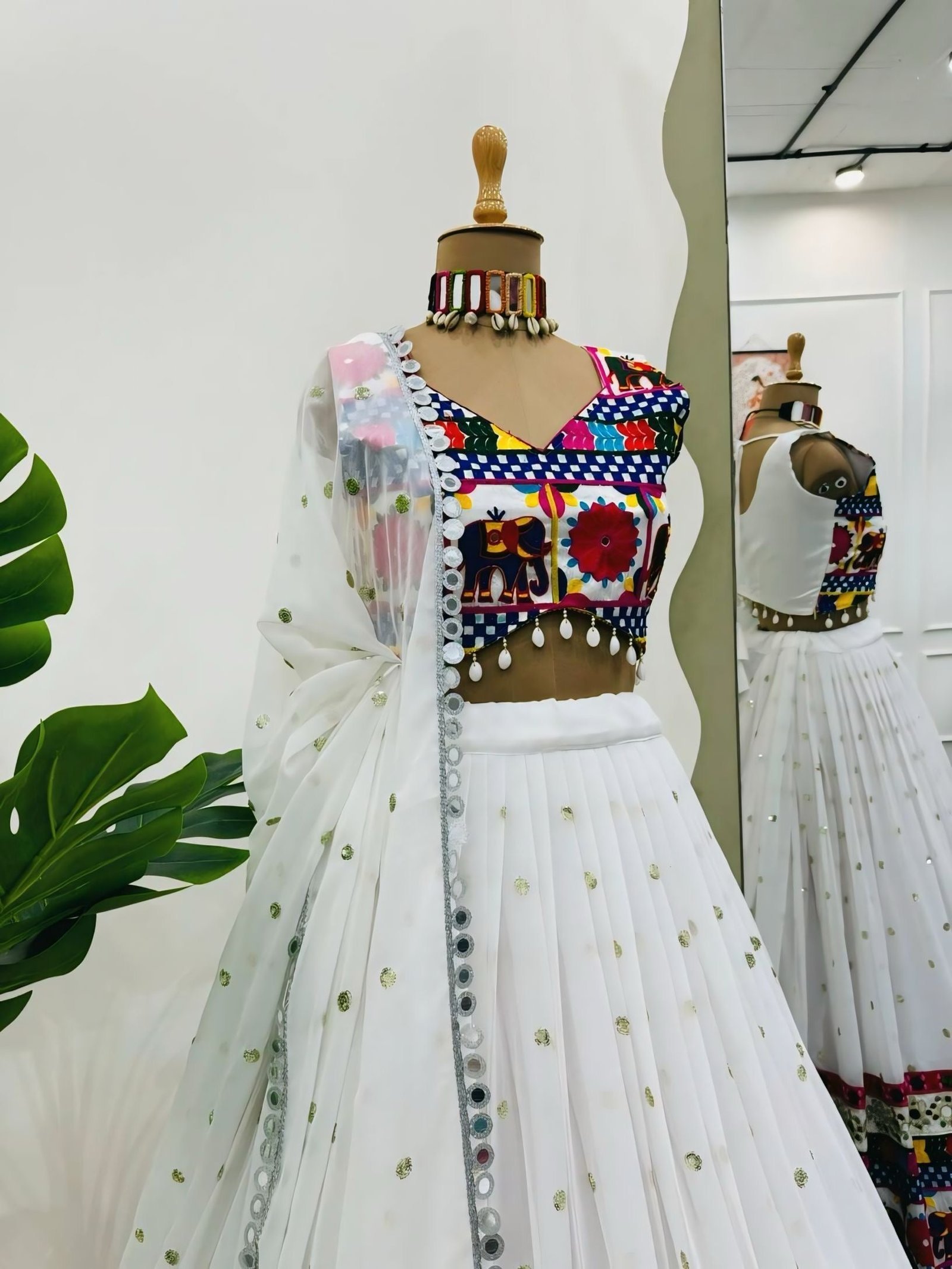 + Free ShippingEmbrace the vibrant colors and intricate details of our COLORFUL EMBROIDERED BLOUSE. Made with Foux gorgette fabric for a comfortable fit, this blouse features delicate sequin and mirror work, as well as charming floral and animal motifs. The semi-stitched lehenga, paired with a cancan and canvas, adds volume and flow to your look. The choli, crafted with Foux gorgette and adorned with kodi lace broder, is also included in this package. Complete the outfit with the beautiful dupata, also featuring intricate sequin and lace work. Available in size up to 44, this outfit is sure to make you stand out at any event.
