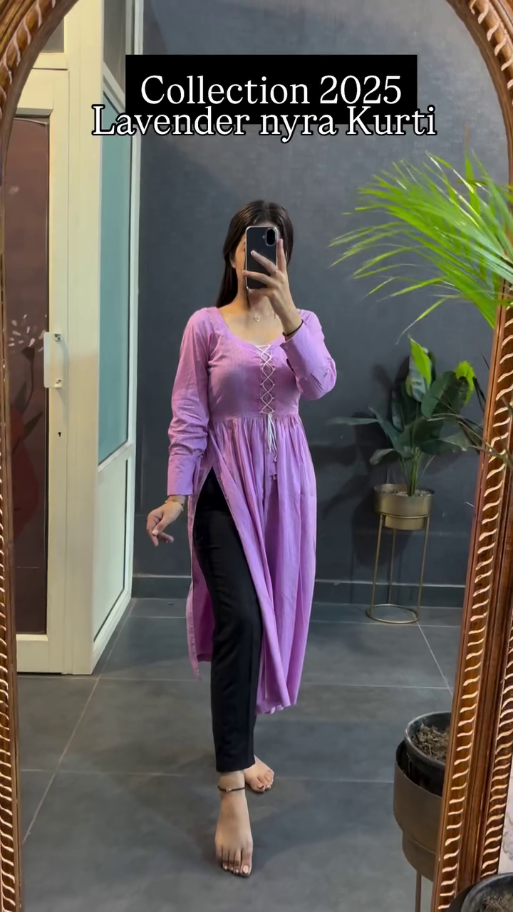 Step into elegance with the Trendy Lavender Nyra Cut Kurti from the 2025 Collection, designed to offer a perfect balance of modern style and ethnic grace. Crafted from comfortable and breathable fabric, this kurti features a unique Nyra cut silhouette with a flared design that enhances movement and elegance. The lace-up detailing at the neckline adds a fashionable touch, making it an ideal choice for casual outings, festive celebrations, and party wear. With its soothing lavender hue and chic design, this kurti is a wardrobe must-have for women who love versatile ethnic wear.