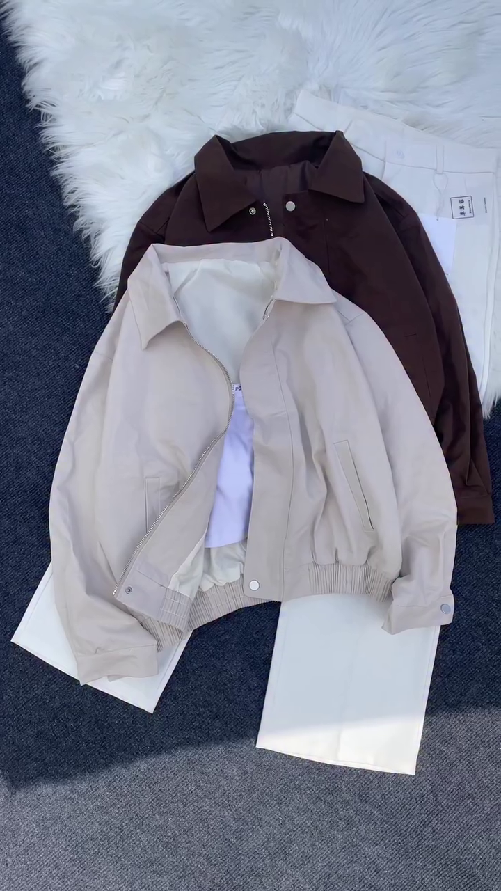Beige & brown bomber jacket with a sporty, casual vibe
