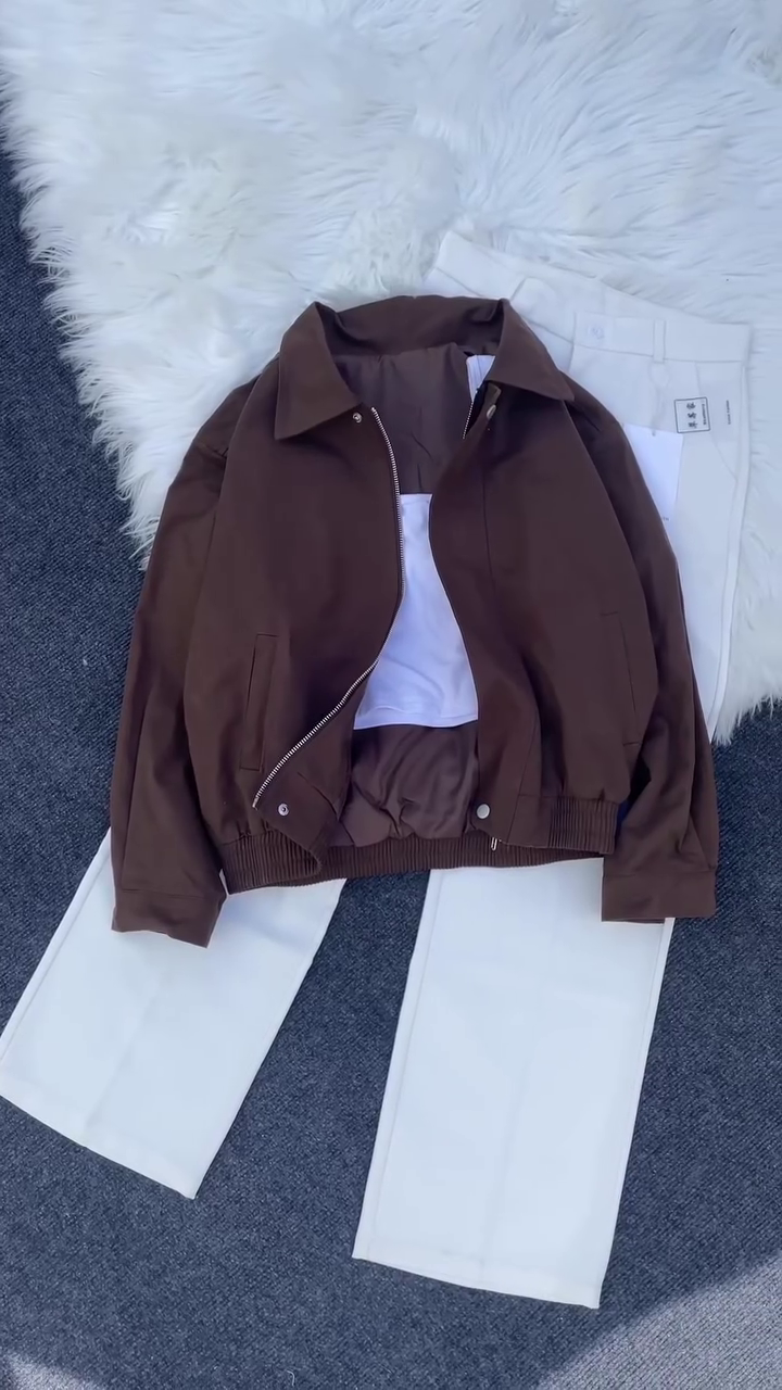 Style Highlight: The mix of neutral bomber jacket tones with crisp white pants creates a bold and effortless streetwear look