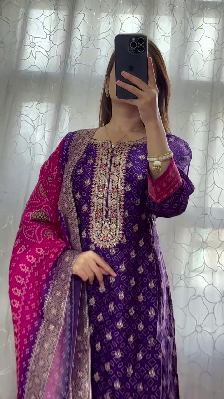 Contrasting Pink Printed Dupatta ? A beautifully contrasting pink dupatta with elegant prints that complements the rich purple kurta and adds an extra layer of sophistication.