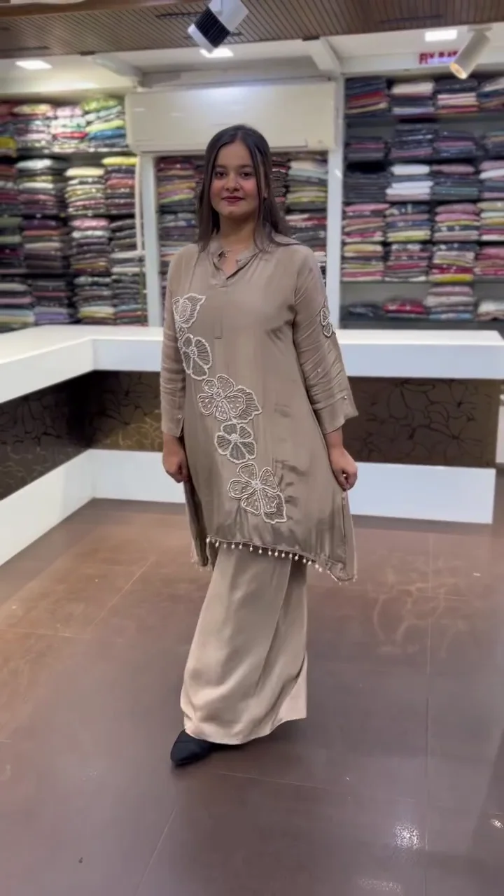 Luxurious Silk-Finish Co-ord Set with Bold Hand-Embroidered Floral Appliqué and Pearl Tassel Hem