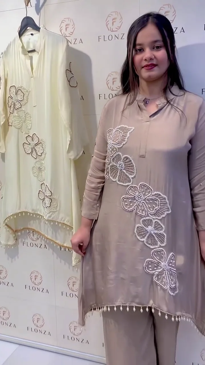 + Free ShippingDiscover effortless sophistication with this premium two-piece co-ord set. Designed with a focus on artistic detail, the tunic features a striking diagonal trail of hand-crafted floral motifs that add texture and dimension. The relaxed, fluid fit of the top is perfectly balanced by wide-leg trousers, offering a look that is as comfortable as it is graceful. Available in muted, high-fashion tones, this ensemble is an ideal choice for festive gatherings, evening soirées, or upscale social events.