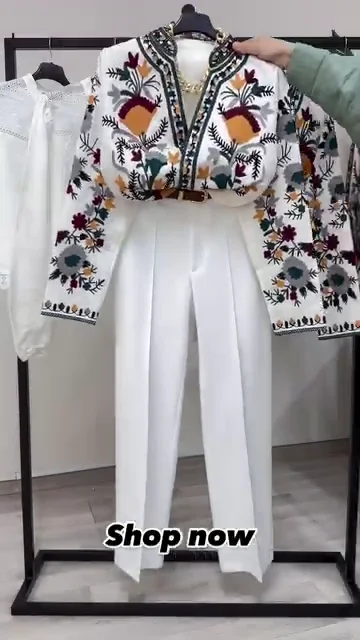 + Free ShippingElevate your wardrobe with this exquisite two-piece set that blends traditional artisan aesthetics with contemporary high-fashion tailoring. Designed for the woman who loves to make a statement, this outfit pairs a vibrant, heavily embroidered top with sleek, architectural trousers for a look that is both bold and refined.