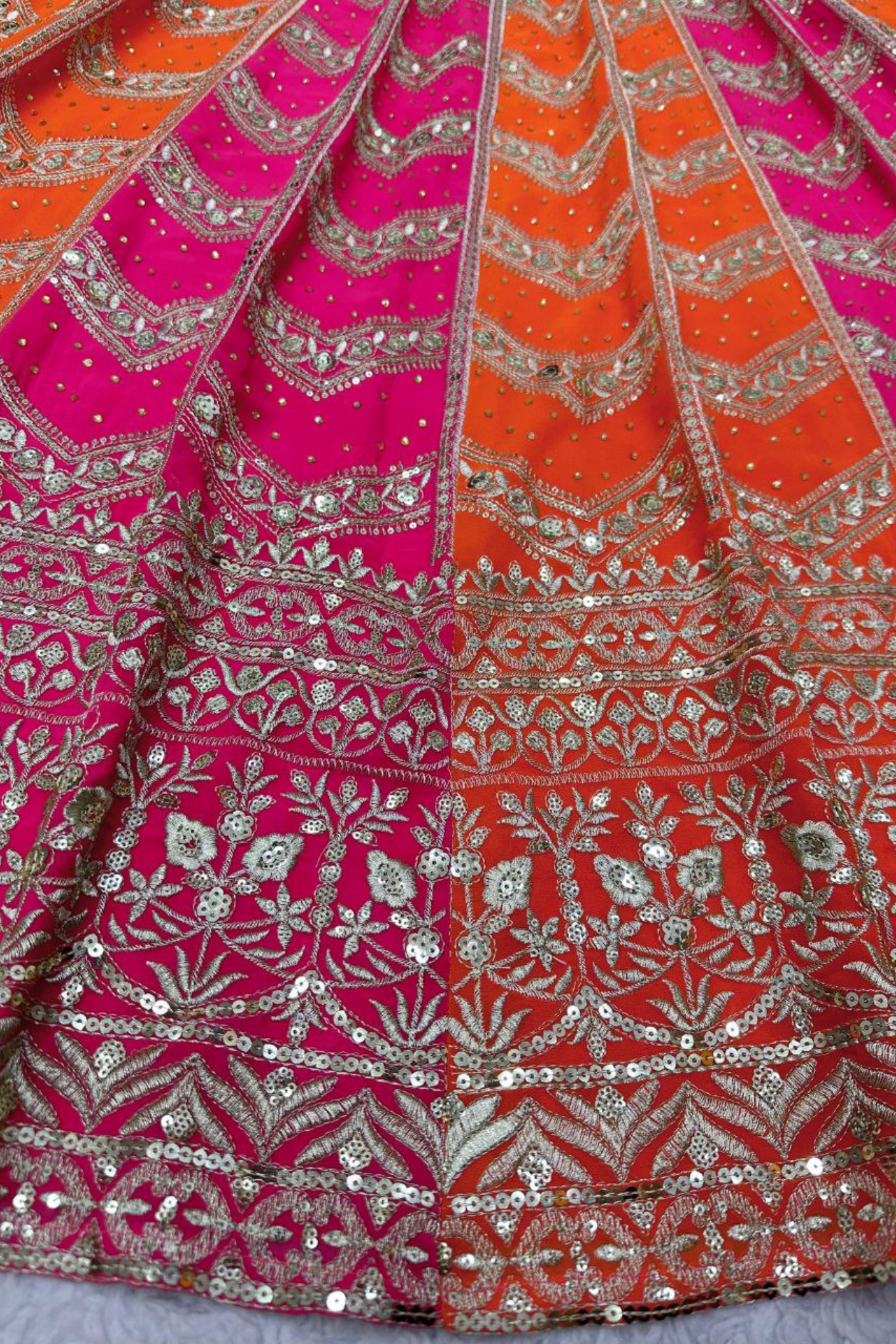 Expertly crafted in Fox Georgette, this Semi-Stitched lehenga features 3+5 mm sequence with real diamond work. With a flair of 4.0MTR and canvas patta, it comes with a cancan for added volume. The Choli, made from the same fabric, boasts of intricate 3+5 mm sequence work and comes in a free size of 44. The Fox Georgette Dupatta is adorned with 3+5 mm sequence work and measures 2.20 MTR. Own this stunning piece up to size 44.