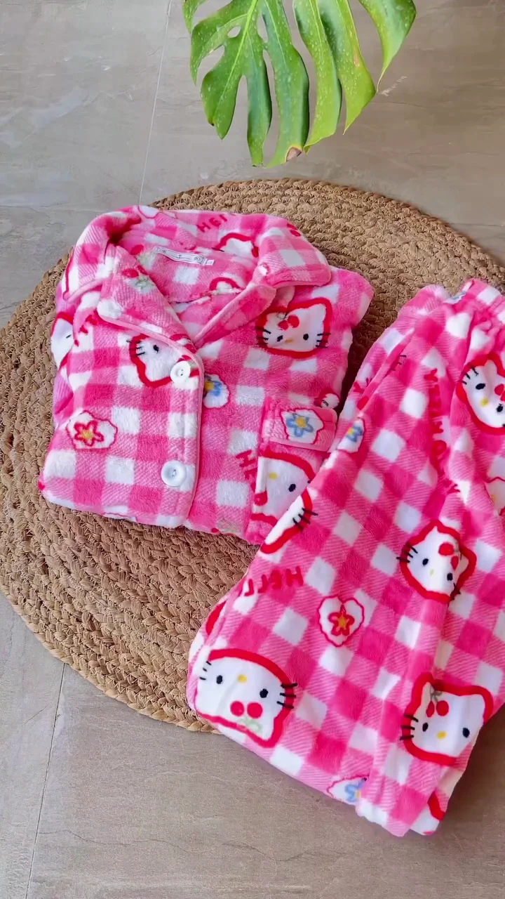 + Free ShippingStay warm and stylish during chilly nights with this Premium Fleece Pajama Set. Designed for maximum comfort, this set features a button-down long-sleeve top with a classic notched collar and matching elastic-waist trousers. Whether you choose the playful pink checkered Hello Kitty inspired print or the elegant white bird motif, the thick, velvet-like fleece material ensures you stay cozy and snug all winter long.