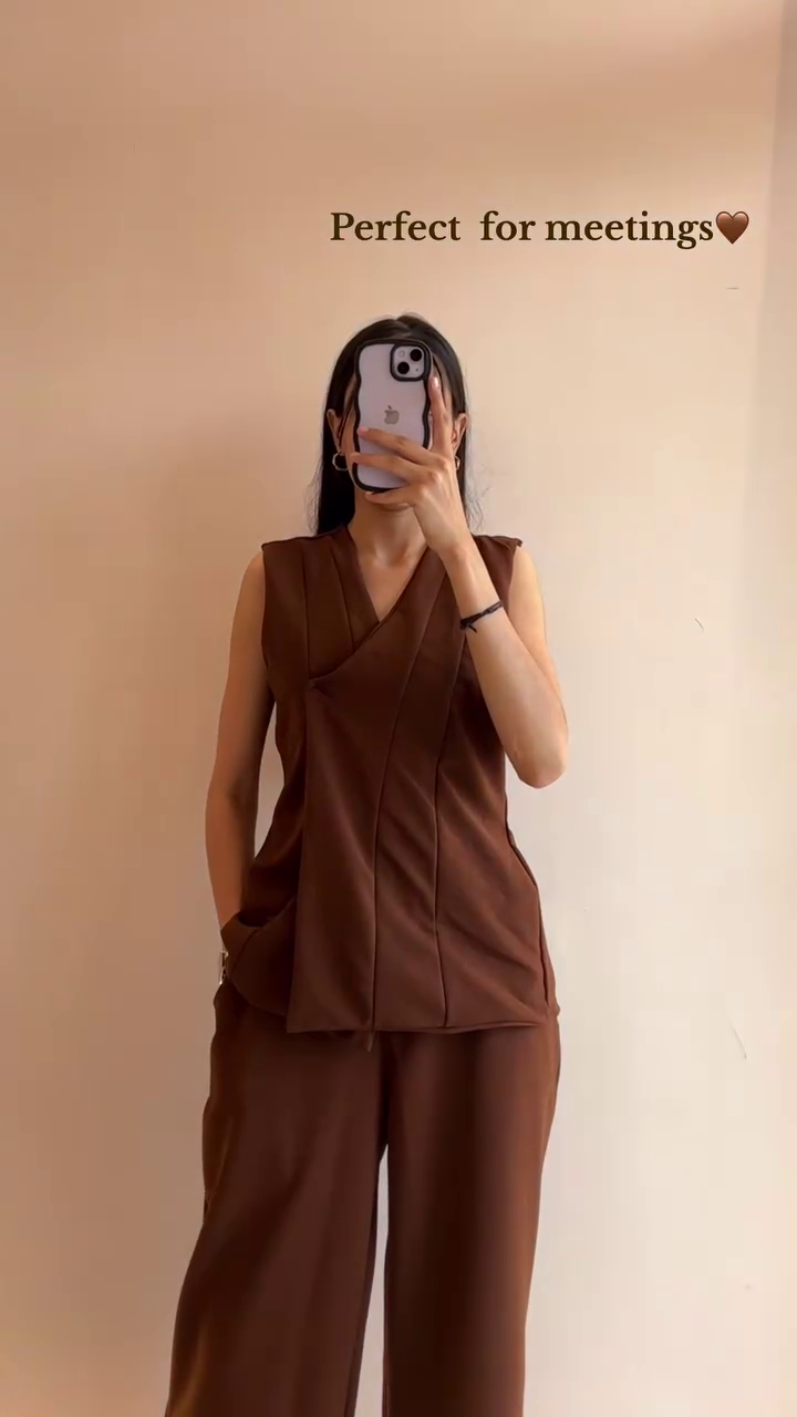 • Brown Sleeveless Overlap Top – Features a modern overlapping design with a sleek sleeveless cut, giving you a sophisticated yet effortless style that transitions seamlessly from work meetings to after-office plans.