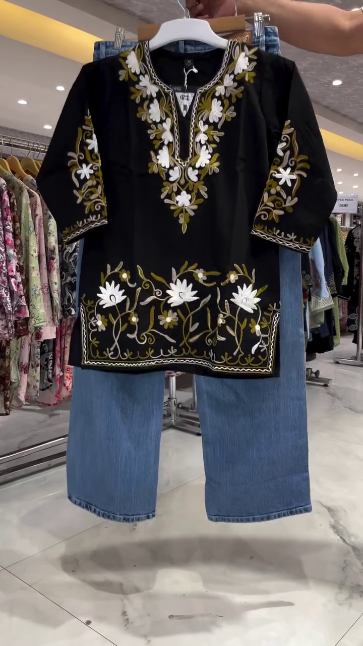 • Style Highlight: The contrast of embroidered black kurti with trendy blue wide-leg jeans makes it a smart, youthful, and fusion-ready outfit