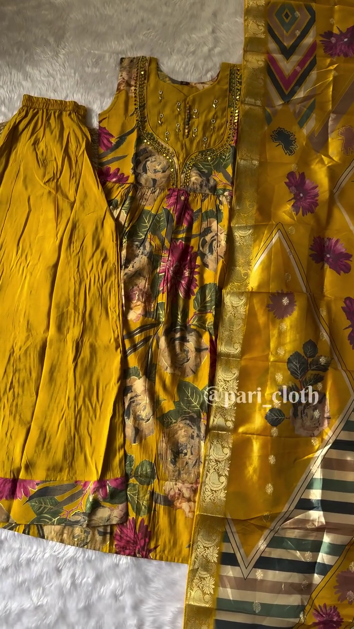 Vibrant Mustard Yellow Kurta: Adorned with floral prints that add freshness and charm.