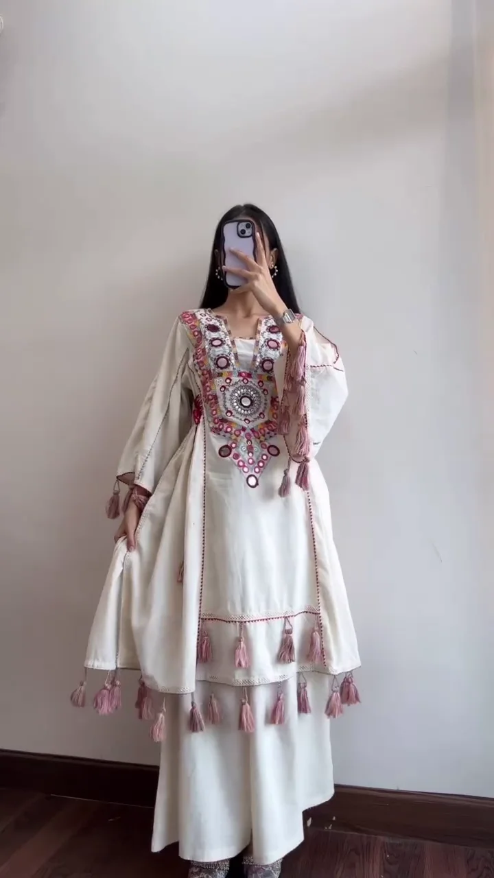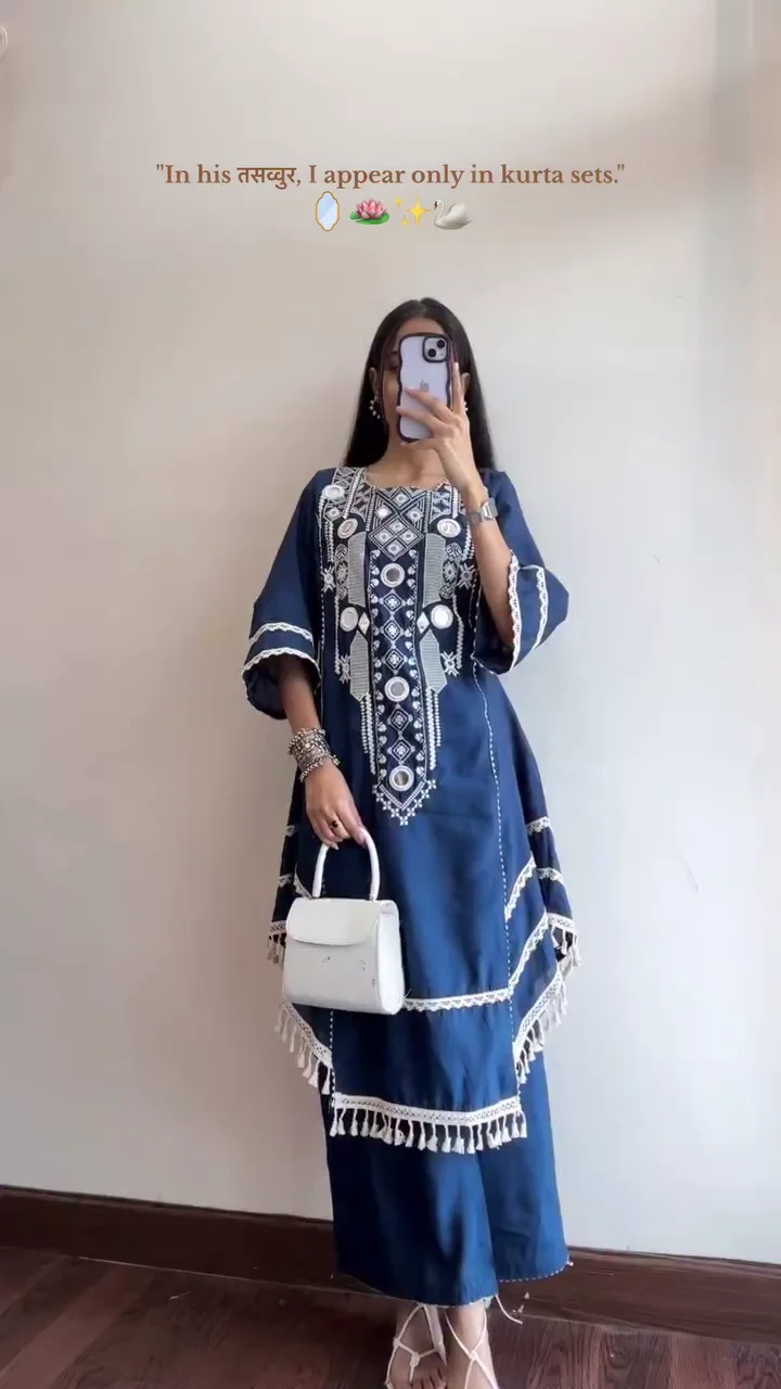 Modern & Traditional Blend: Combines the richness of ethnic mirror and thread embroidery with a contemporary kurta design.