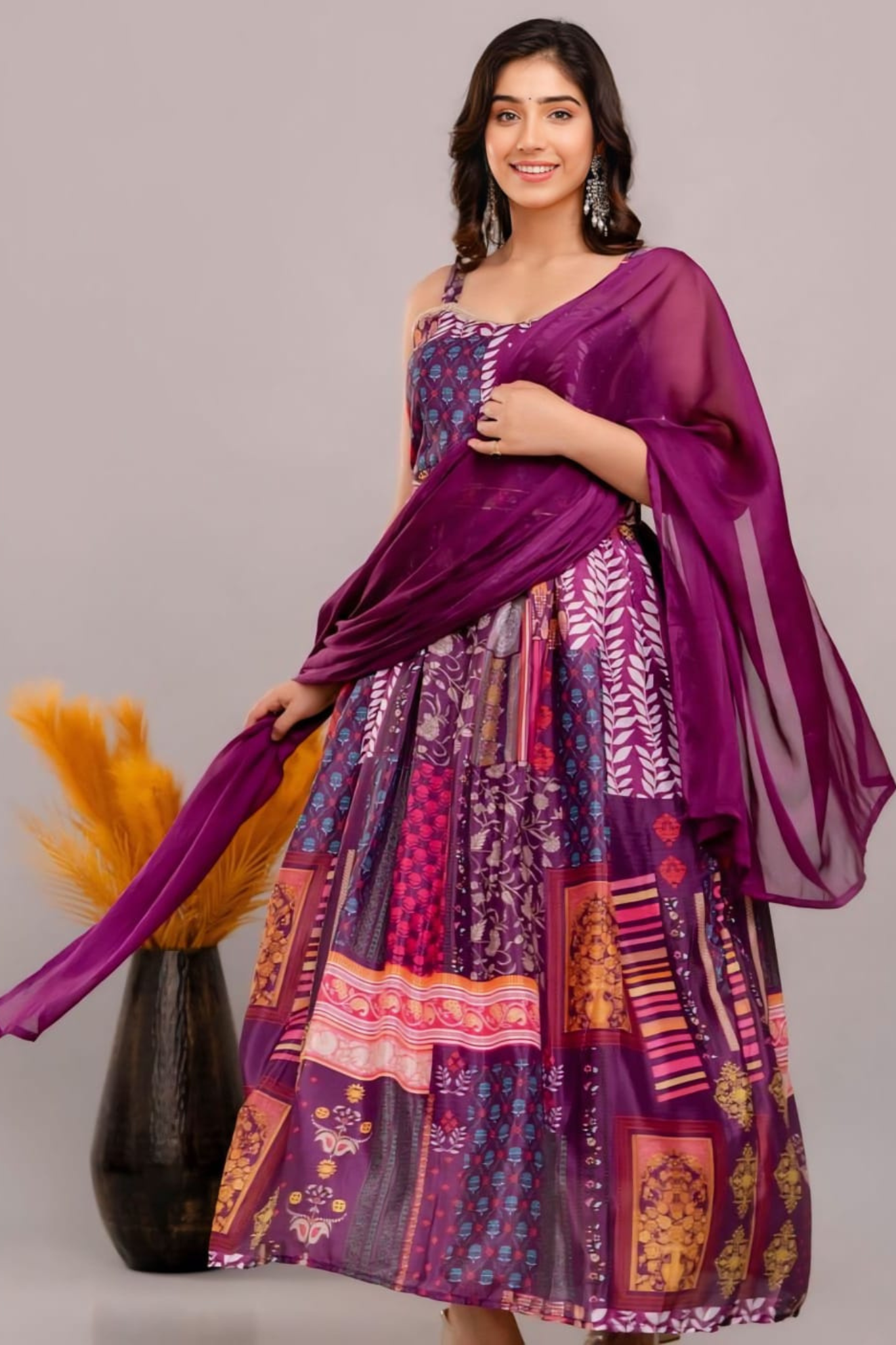 VIBRANT PATCHWORK MAXI DRESS WITH CHIFFON DUPATTA
