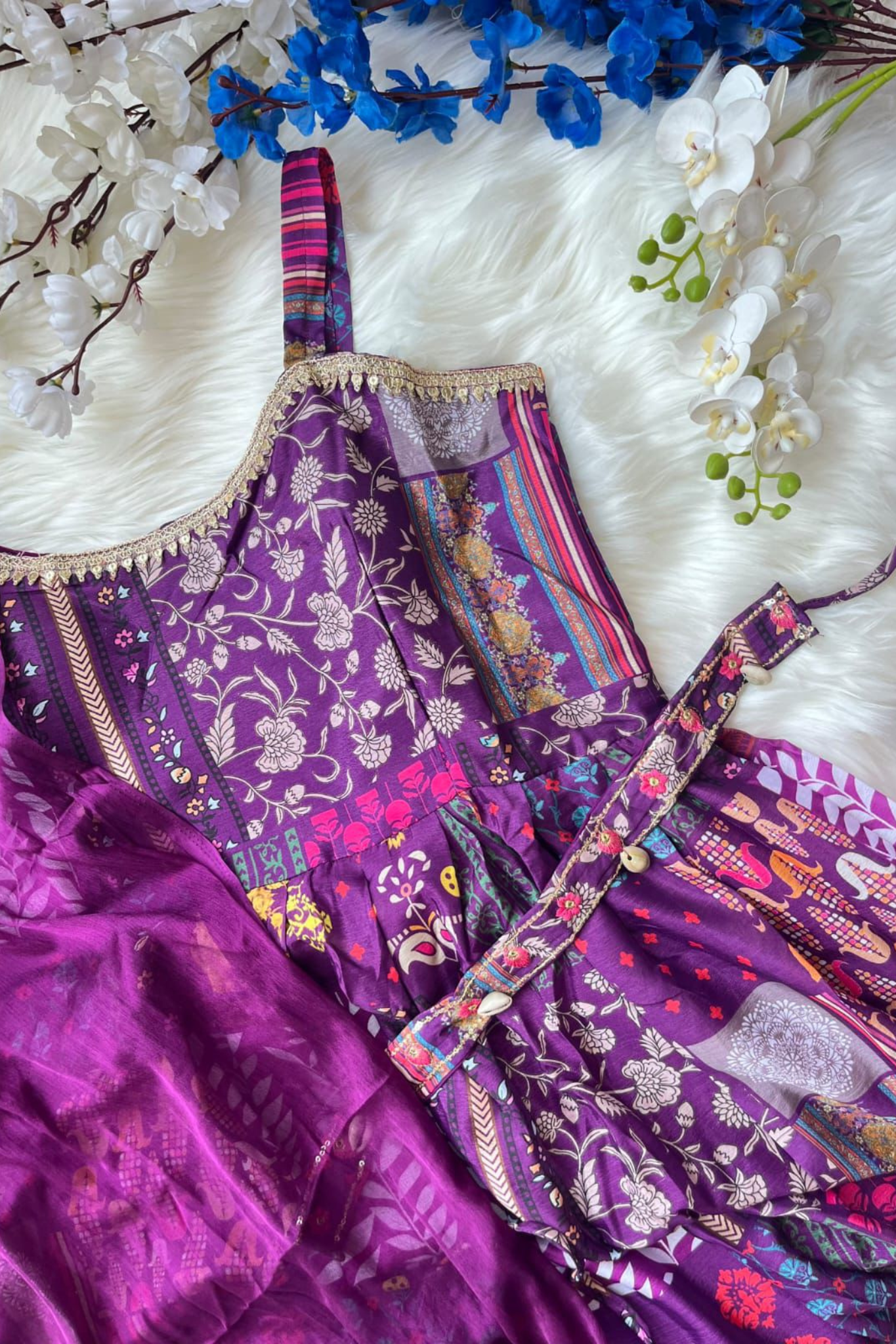 + Free ShippingElevate your style with our Vibrant Patchwork Maxi Dress. The beautiful aqua georgette fabric is adorned with a striking print, while the strappy sleeves feature cowrie and yarn tassel detailing. The dress also includes kodi lacework and a golden sequence yoke, perfect for weddings or special occasions. Complete the look with the included belt and chiffon dupatta.
