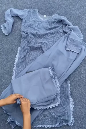 Ethereal Dusty Blue Hand-Embroidered Chikankari Georgette Suit – 3-Piece Festive Set with Scalloped Lace Finish