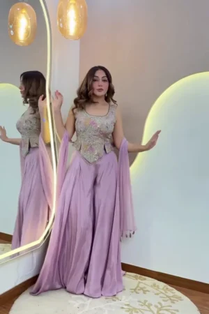 Exquisite Lilac Embroidered Peplum Sharara Set – Heavily Embellished Sleeveless Floral Tunic with Voluminous Pleated Palazzo Trousers and Matching Sheer Dupatta – Premium Festive & Wedding Guest Occasion Wear