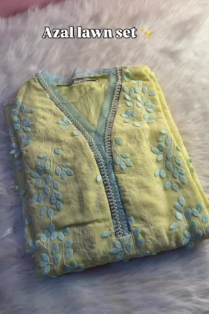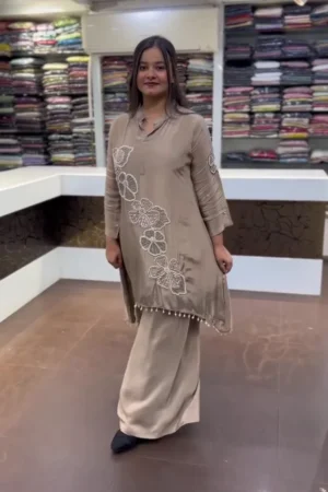 Luxurious Silk-Finish Co-ord Set with Bold Hand-Embroidered Floral Appliqué and Pearl Tassel Hem