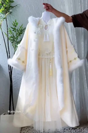 Elegant Ivory Hanfu-Inspired Winter Cloak and Dress Set with Luxurious Faux Fur Trim, Delicate Butterfly Appliqués, and Tassel Accents